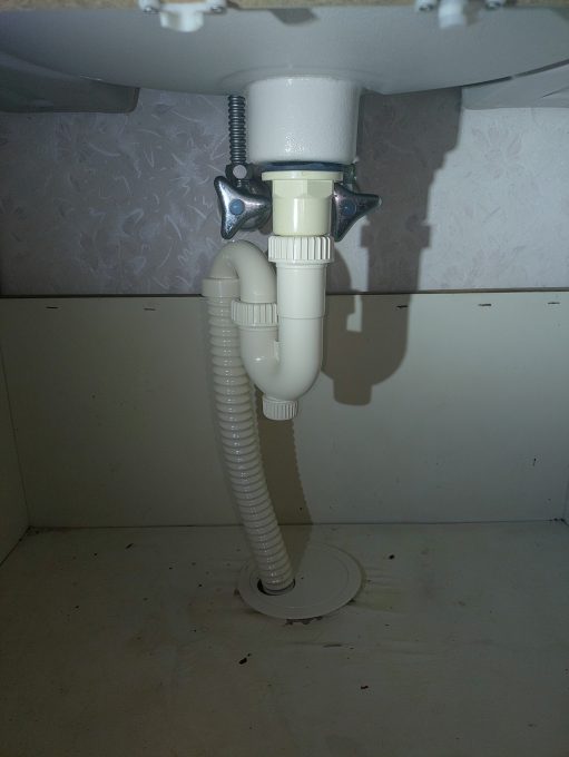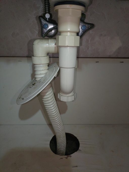 洗面所の床が濡れるとのご依頼で点検させていただくと、排水Sトラップからの水漏れと防臭キャップがなく排水管の臭いが家に上がってきていることがわかりました。