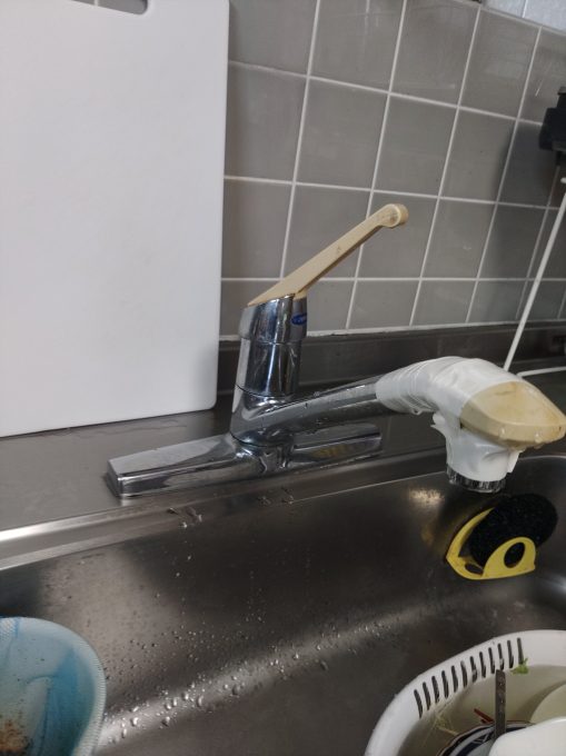 お伺いさせていただき症状をお聞きしますと、蛇口の先端に亀裂が入って使用すると水が飛び散るからとりあえずテープを巻いて使用している。とのことでした。